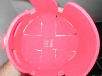 Une fois à ce stade, prenez des chutes de tapis de mousse et tracer des triangles aux dimensions des trous du dessus du casque afin de le fermer. On arrive alors ici :