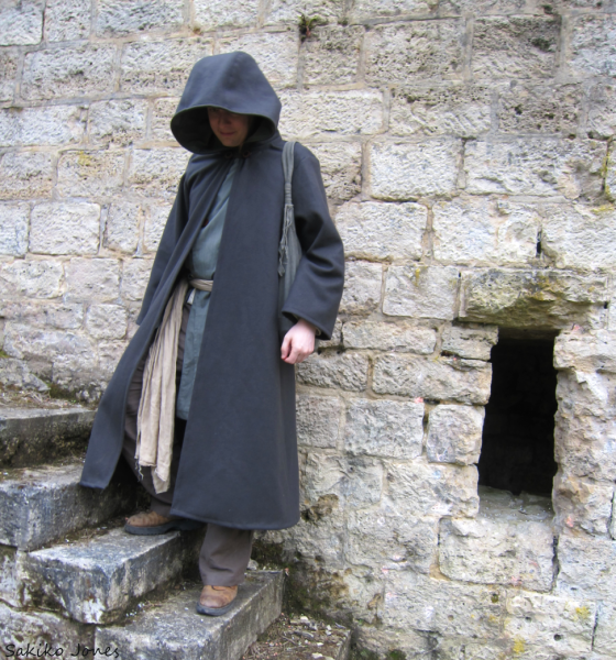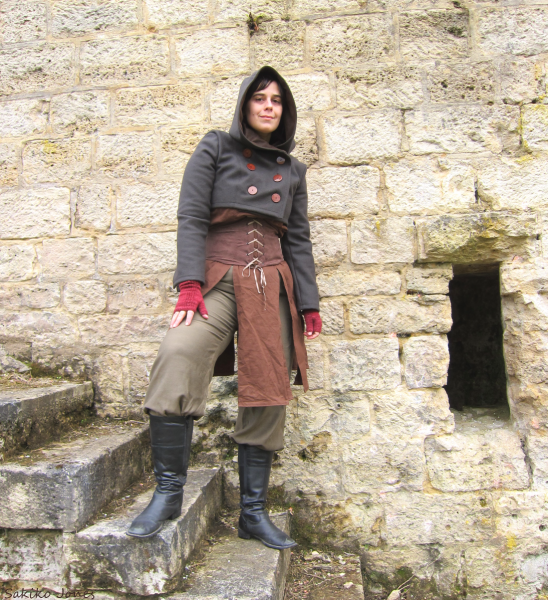 Peu de couture ici, juste la petite cape et de pseudo vambraces réalisées avec de la laine et du skaï de récupération. La base du costume est une tenue de judo taille 14 ans un peu retouchée et customisée, soit 5 euros la tenue d'occase chez Emmaüs, 5 euro pour la teinture du pantalon et encore environ 3 euros de pâte fimo pour des boutons et un pendentif. Faute de bottes, une copine m'a gentiment bricolé un genre de jambières en skaï à porter par-dessus des chaussures confortables.