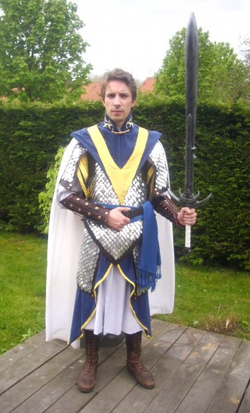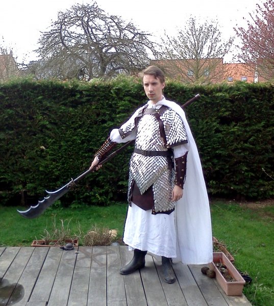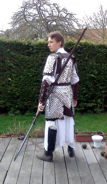 sinon même conseil que plus haut ... superbe travail... mais trop "clean"...mettre des tenues moins "blanches" et le fait de porter de la "vrais ferraille" implique de porter un coletin gambisoné( voir sur foire médiévale) c'est chaud mais tu aura moin mal aux épaules....