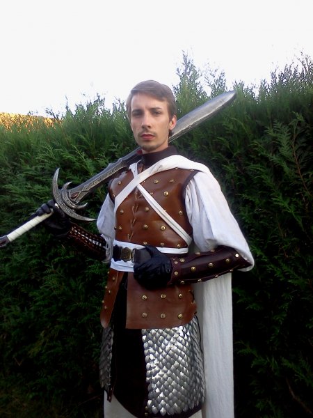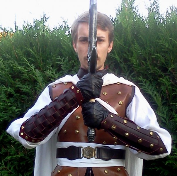 Moi je crois que le vrai problème de ton costume c'est les finitions, avant d'ajouter des accessoires et de "user" ceux que tu as déja fait il faut retravailler tes finitions. Par exemple pour tes avants bras on dirait que tu as juste de découpé le cuir que tu l'as assemblé puis ajouté les clous dorés, ce qui fait la vraie finesse de ce genre de travaux c'est que déja tu retravailles tes coupes en renforçant les bords que ce soit avec un tressage ou en cousant avec de la grosse corde, j'ai vu le travail d'azurion et il fait ça très bien, de meme ton top en cuir clair avec les clous mérite lui d'être mattellassé ainsi que gravé ça ajouterait a la personnalité de ton personnage, donnerait aussi du volume ainsi que de la distinction. Il en est de meme pour ta cape qui est bien trop lisse, les capes doivent etre vraiment travaillées aussi, tu devrais ajouter les rebords par exemple rouge ça reste bien dans l'esprit kaamelott. Je sais pas si tout ça est vraiment claire mais je connais pas encore le vocabulaire pour décrire toutes ces choses la. En tout cas en dehors de ça c'est du super taff tes costumes bravo!