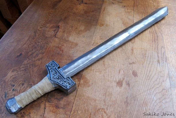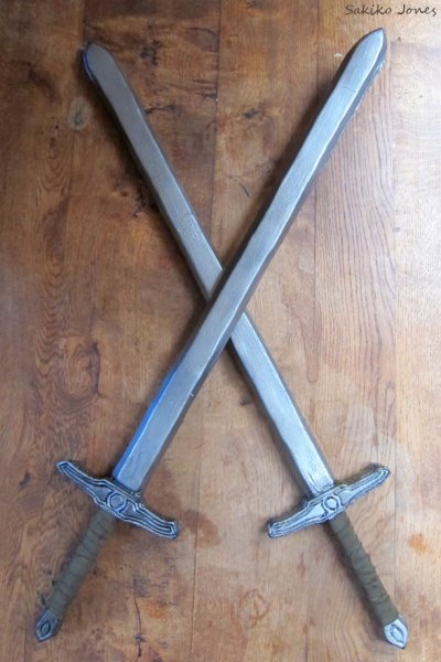 J'ai ajouté des bas en nylon pour cacher les erreurs de découpe des épées puis plusieurs couches de dip et de bombe métallisée. Les gravures ont été réalisées avec un bête fer à souder et pour certaines soulignées à l'aide d'acrylique noire.