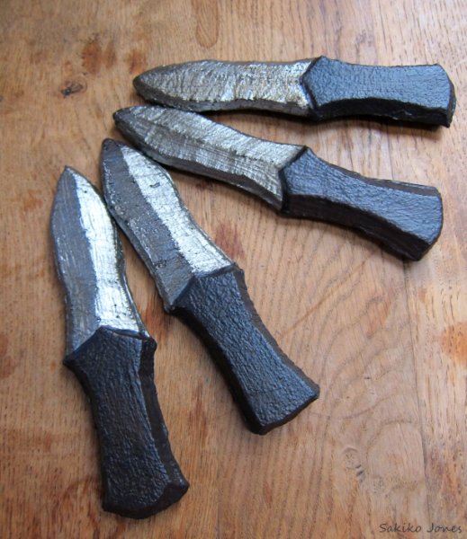Les épées sont très belles, propres et des gardes finement décorées. Les couteaux de lancé, on voit que tu n'as pas pu utilisé de bas nylons pour cacher les imperfections ;)