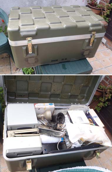 Réalisé en sapin, recouvert de plaques d'alu, de cornières, de rivets, de charnières... Il pèse un âne mort, c'est parfait contre les voleurs.