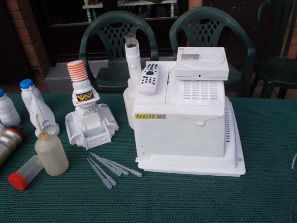 Alors un analyseur positrucmachin. Fait avec: un dérouleur à papier toilette, un fond de TV hertzienne, une télécommande universelle, un radio-réveil et un sabre laser qui fait du bruit et de la lumière.