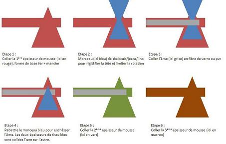 Comme ça j'ai pas à sculpter le manche: je fais un carré de 3 couches de tapis 1cm autour de la fibre+un rondin un peu plus fin juste avant le fer que je renforce avec 2 épaisseurs de mousse (donc 5cm pour que ça casse pas!).
