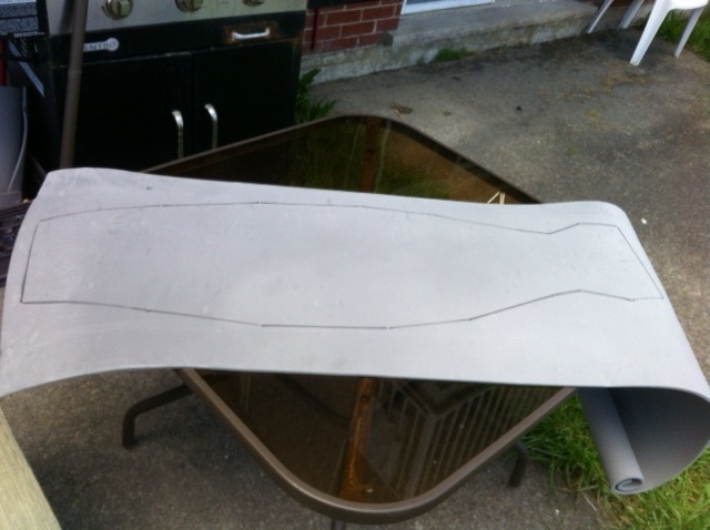il suffit d'agrandir (facteur 600% à vue de nez) le patron à la photocopieuse (ne pas tenir compte des onglets de collage), reporter sur du tapis mousse (coller bord à bord, avec des bords à 90° pour une fome ronde, bisauter à 45° le bord du tapis de sol pour un pli marqué).