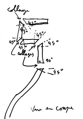 - sur le patron original (qui est prévu pour fabriquer l'objet en papier fort), il y avait des traits (sans doute en pointillé), correspondant à des pliures à faire sur le papier. on ne peut pas plier la mousse : à la place il faut couper le patron original au niveau de ces traits pour faire plusieurs morceaux de patron (et donc plusieurs morceaux de tapis mousse). au niveau des bords de ce trait de pliure, la mousse doit être bisauté avec un angle fonction de l'amplitude de pliure. l'évasement de ton vase forme un succession de pliage (à vue de nez) de -45°,-90, +90°,+90°, ce qui veux dire des bords bisautés pour chacune des ligne de pliage à -45°et90, puis -45°-45°puis +45°+45° puis +45°+45°comme sur le schéma :