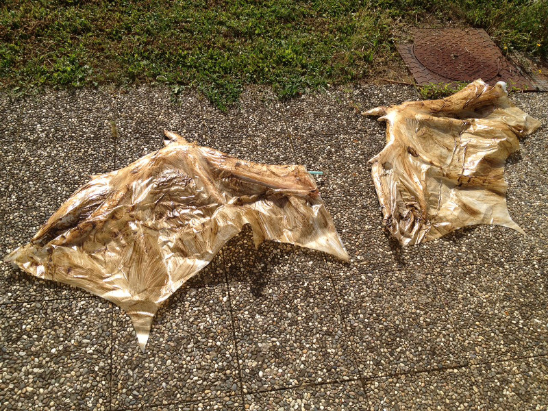 selon l'épaisseur de la bache plastique utilisée, elle ne se rétracte pas de la même façon... une bache de 35 micron donne un effet de peau diaphane fine et plisse finement, une bache de 50 micron ou plus donne un effet "carapace chitine brillante" et fait des gros plis.