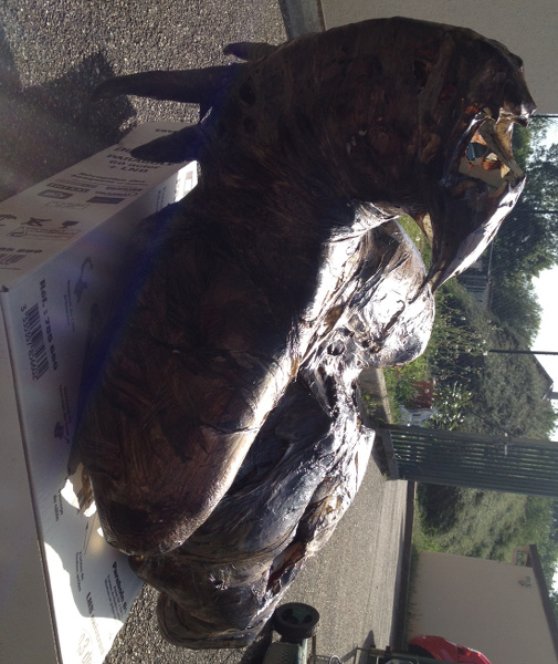 il y a un autre moyen, encore moins cher et plus rapide : enroule de larges bandes de bache plastique en polyéthylène ou découpés dans des grands sac plastique (l'avantage des sacs plastiques, c'est qu'on peut trouver pas mal de couleur). une fois bien recouvert, on fait rétracter le plastique avec un décapeur thermique (cette étape est in croyablement rapide à faire : on obtien un rendu chitineux-organique. On peut aussi utiliser de la bache plastique trsparente pour obtenir des effets de transparence.